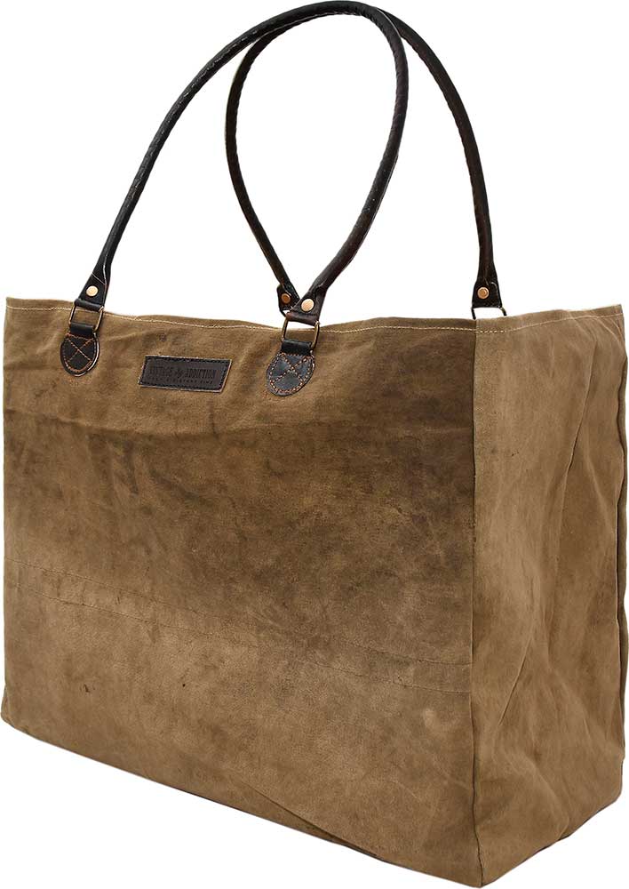 Our gorgeous oversized tote is handcrafted with recycled canvas, has 1 interior pocket, is fully lined, and has leather handles.
