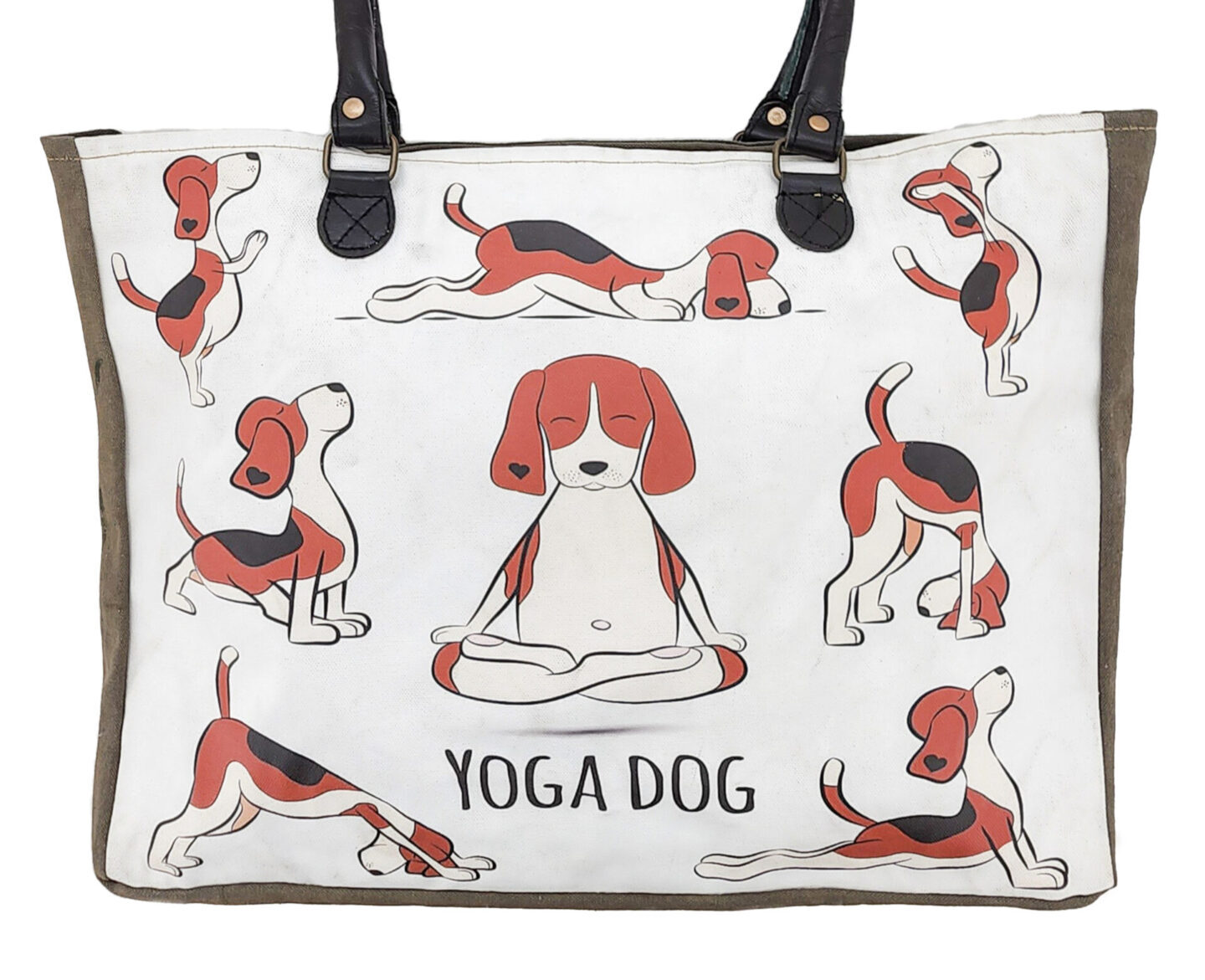Our market tote is handcrafted with authentic recycled military tent, has a zipper top closure as well as 1 interior pocket, is fully lined, and has rolled leather handles with a comfortable 12.5 inch drop.